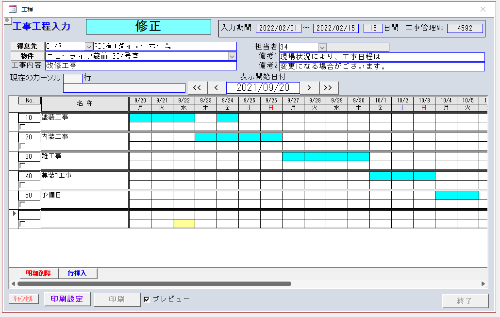 弊社のPCできる蔵はオーダーメイドシステムですので、このように、お客様のご要望に応じてガントチャート表示したり、そこからのデータ登録が出来るようにする事も可能です。