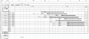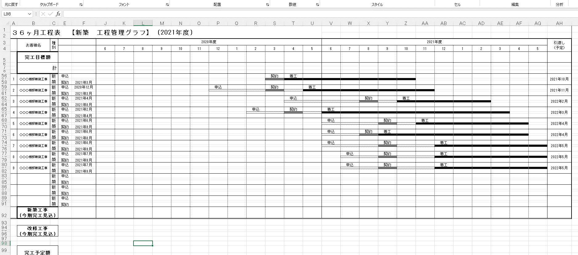 こちらは住宅メーカー様の新築工事の工程管理です。申込・契約・着工・引渡といった工程を色分けしてExcelに出力しています。そのまま印刷できるよう、あえてカラーでななく白黒で各工程を表せるようにしています。