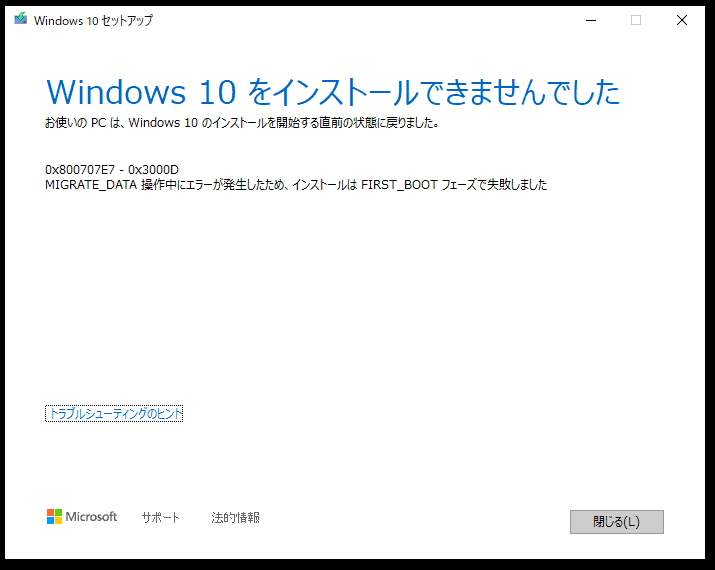 0x800707E7 – 0x3000D MIGRATE_DATA 操作中にエラーが発生したため、インストールは FIRST_BOOT フェーズで失敗しました。