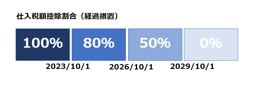 2023年以降、発注先や仕入先がインボイス制度していないと仕入税額控除を全く受けられなると思われている方のいらっしゃるようですが、実際にはインボイス制度が開始されるのが2023年、以後6年間は「経過措置」期間が設けられています。この期間は段階的に一定割合で仕入税額控除を受けられますので、いきなり全額控除が無くなってしまう訳ではありません。