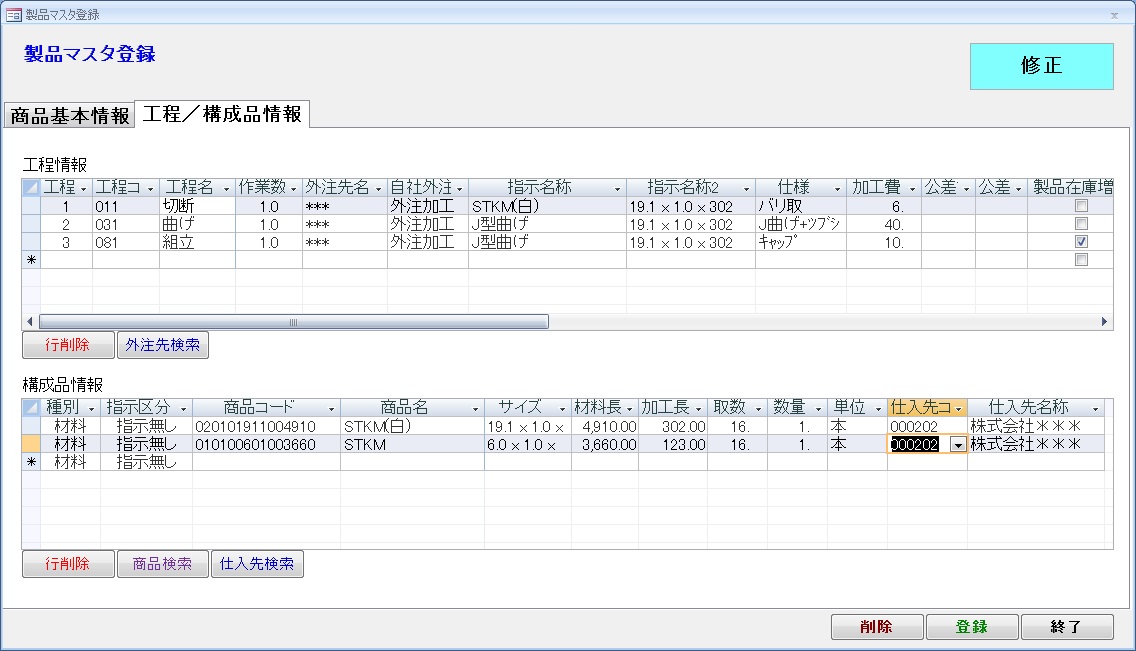 行程の進捗管理や、工程ごとに必要な原料の管理等であれば以下の様な画面のシステムで十分で、高価なシステムを導入する必要は無いかもしれません。
