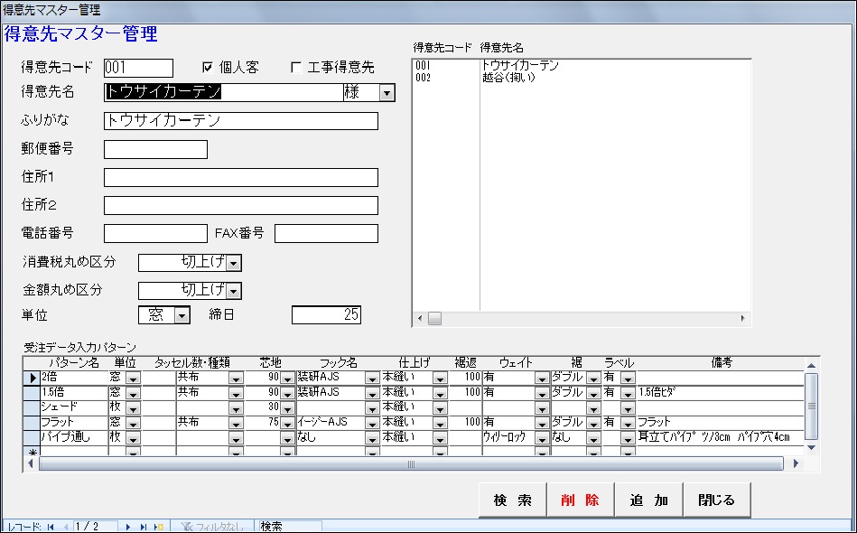 商品種類・縫製方法等、得意先ごとに異なる価格を商品や要尺、縫製などのパターンを登録することで、受注処理・要尺計算・縫製指示を行うことができます。
