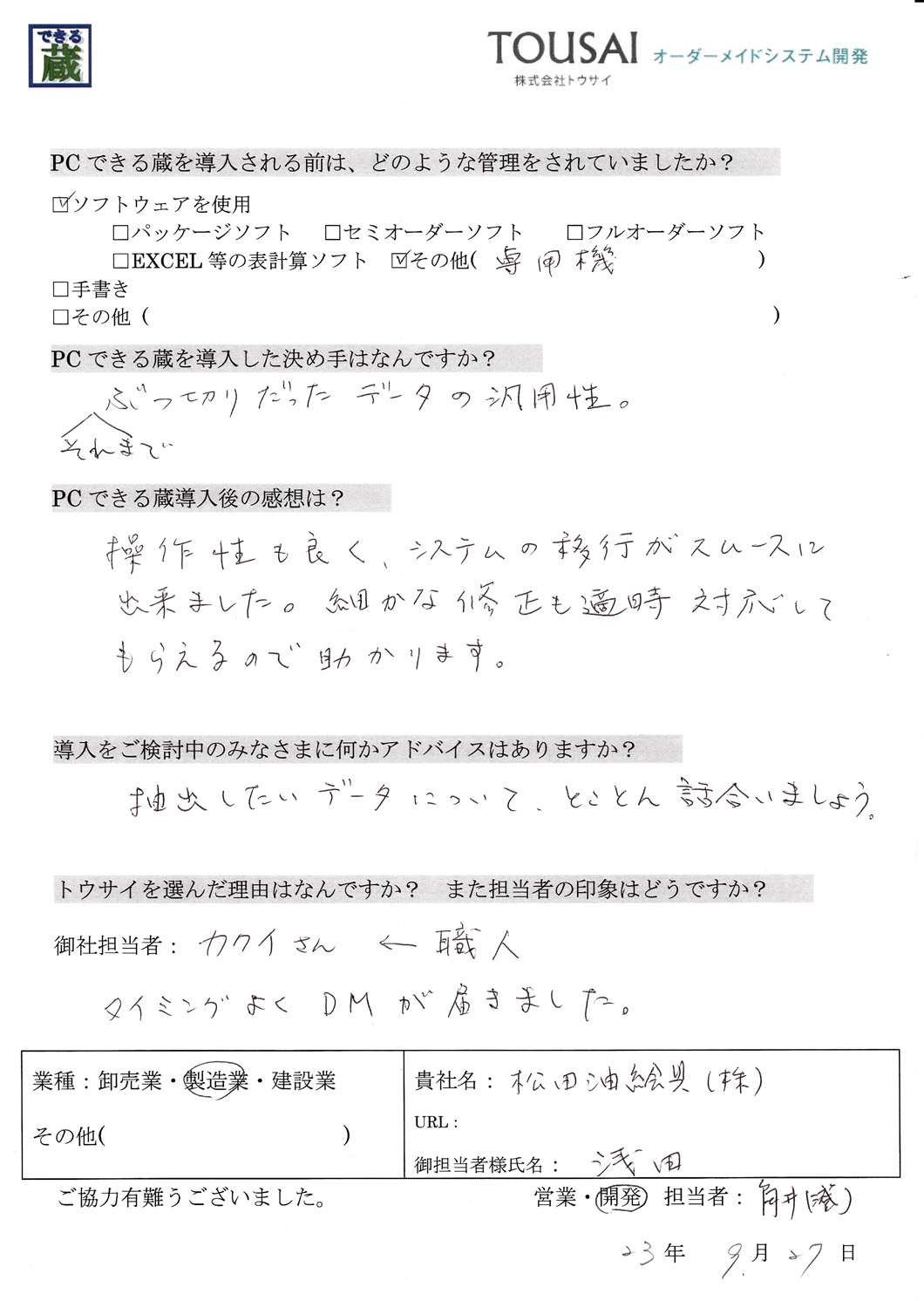 大きなトラブルも無く、稼働できたのも、社長初め、ご担当者様が熱心に運用されたおかげと感謝しております。