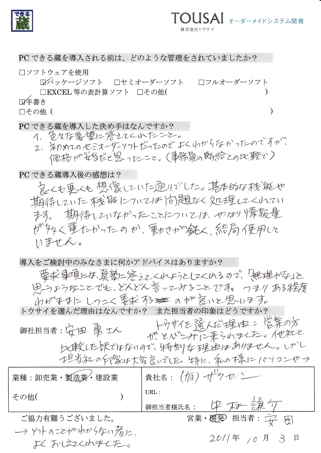 2.初めてのセミオーダーソフトだったので、よくわからなかったのですが、価格が妥当だと思ったこと。(事務員の時給との比較で)