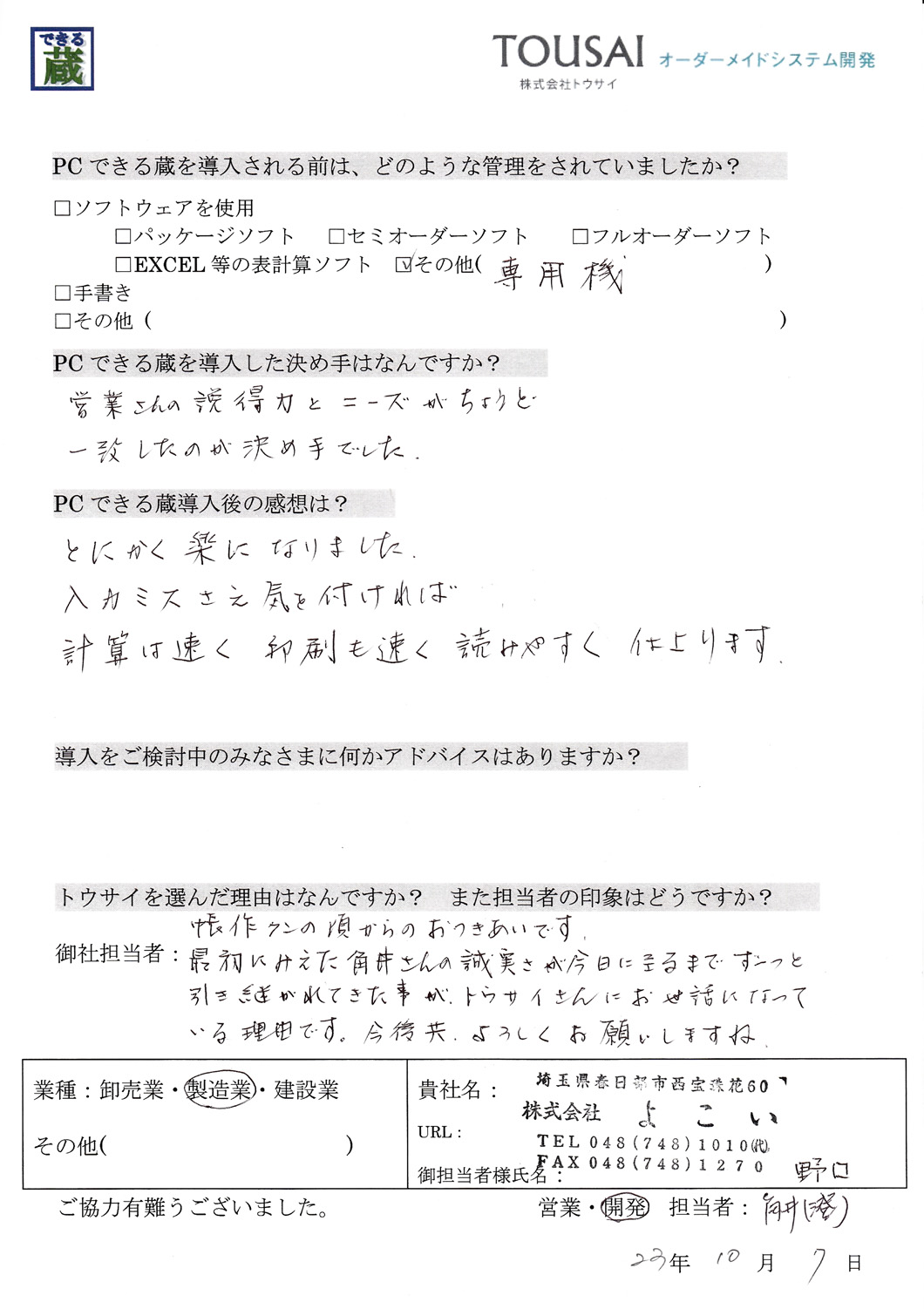 最初にみえた角井さんの誠実さが今日に至るまでずーっと引き継がれてきた事がトウサイさんにお世話になっている理由です。今後共、よろしくお願いしますね。