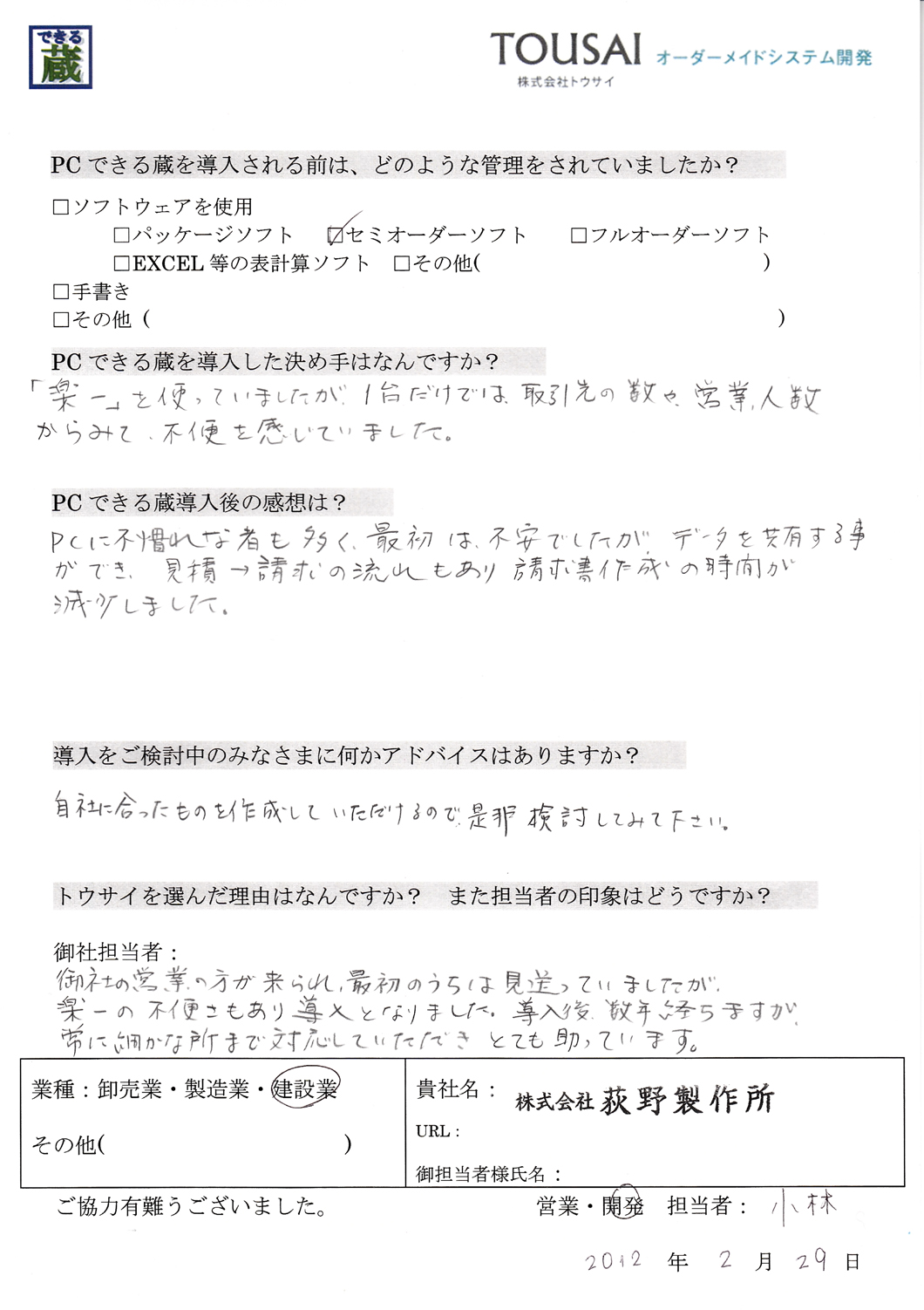 PCに不慣れな者も多く、最初は不安でしたが、データを共有する事ができ、見積→請求の流れもあり請求書作成の時間が減少しました。
