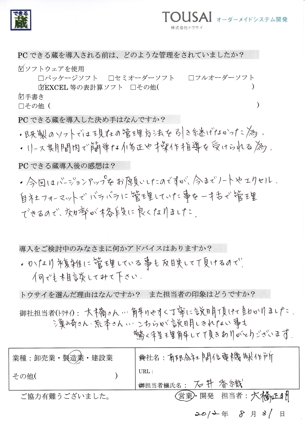 ・今回は、バージョンアップをお願いしたのですが、今までノートやエクセル、自社フォーマットでバラバラに管理していた事を一括で管理できるので、効率が格段に良くなりました。