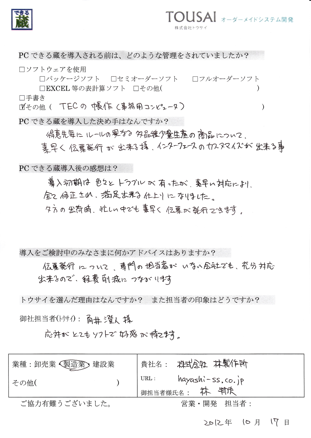 会社名 株式会社 林製作所 様  http://www.hayashi-ss.co.jp/