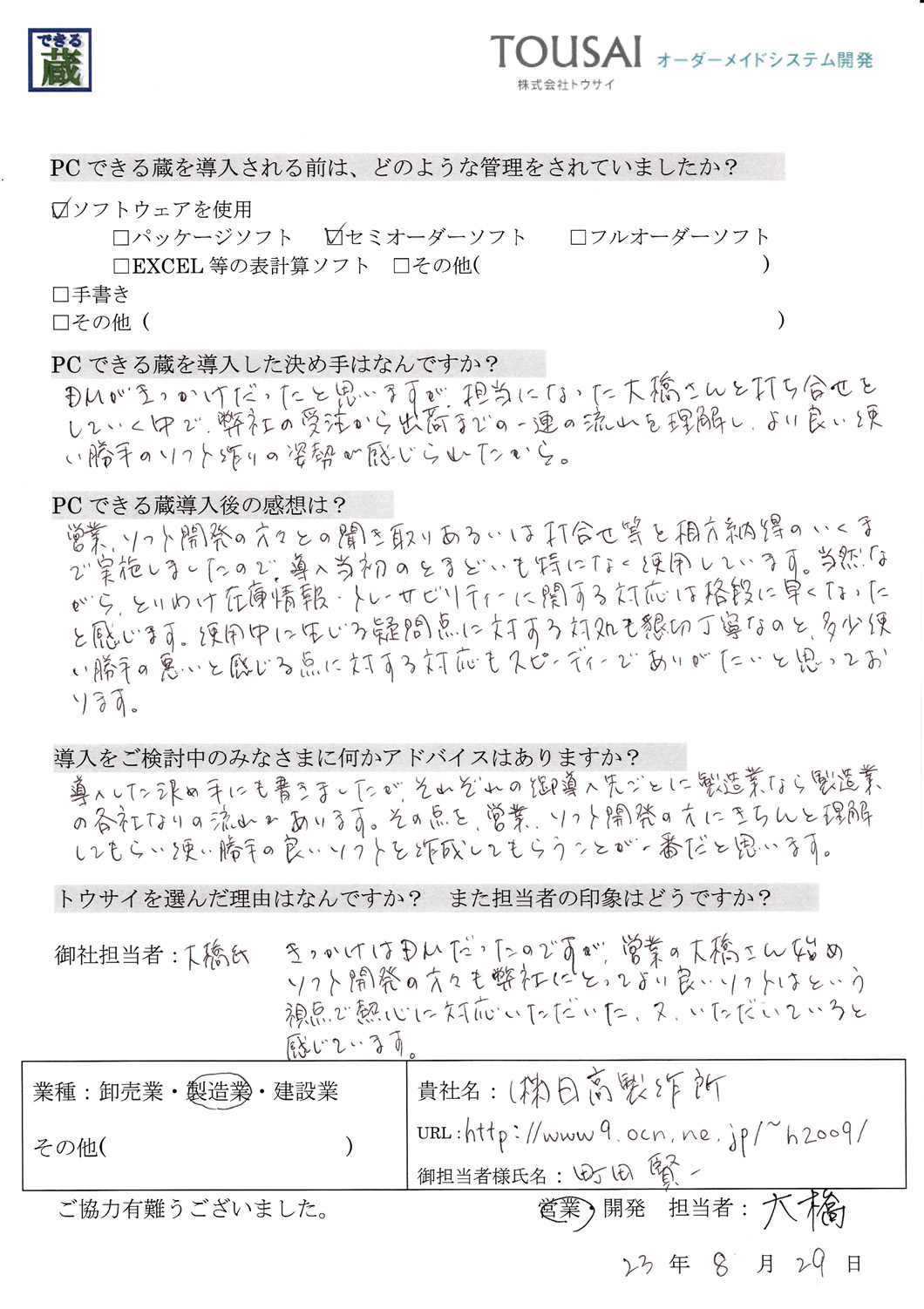 きっかけはDMだったのですが、営業の大橋さん始めソフト開発の方々も、弊社にとって良いソフトは.という視点で熱心に対応していただいた、又、いただいていると感じています。