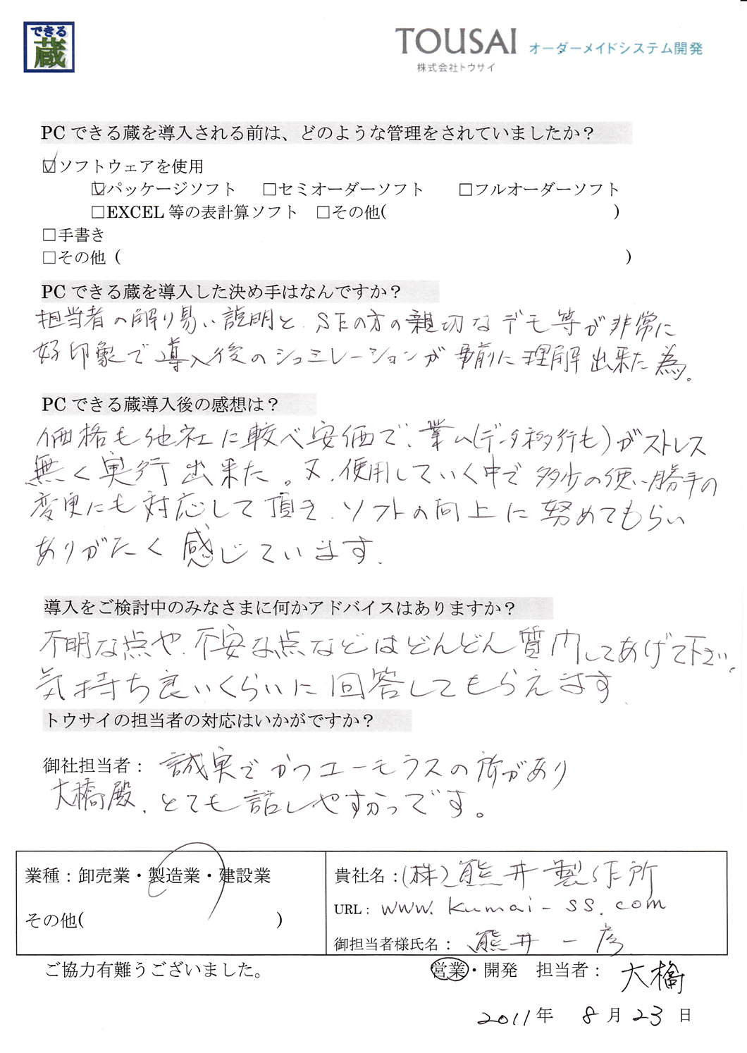又、使用していく中で多少の使い勝手の変更にも対応して頂き、ソフトの向上に努めてもらい、ありがたく感じています。