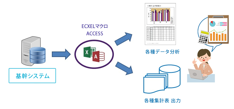…基幹システムより出力されるデータを基に、今までできなかった各種集計や、 今までとは違う角度からのデータ分析を行い、今後の経営戦略に役立てたい