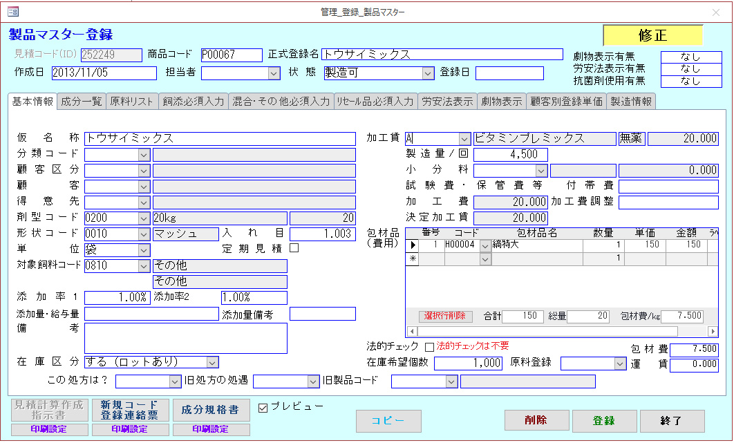 製品情報管理も、成分、原料等、細分化した情報を体系的に管理することが可能です。