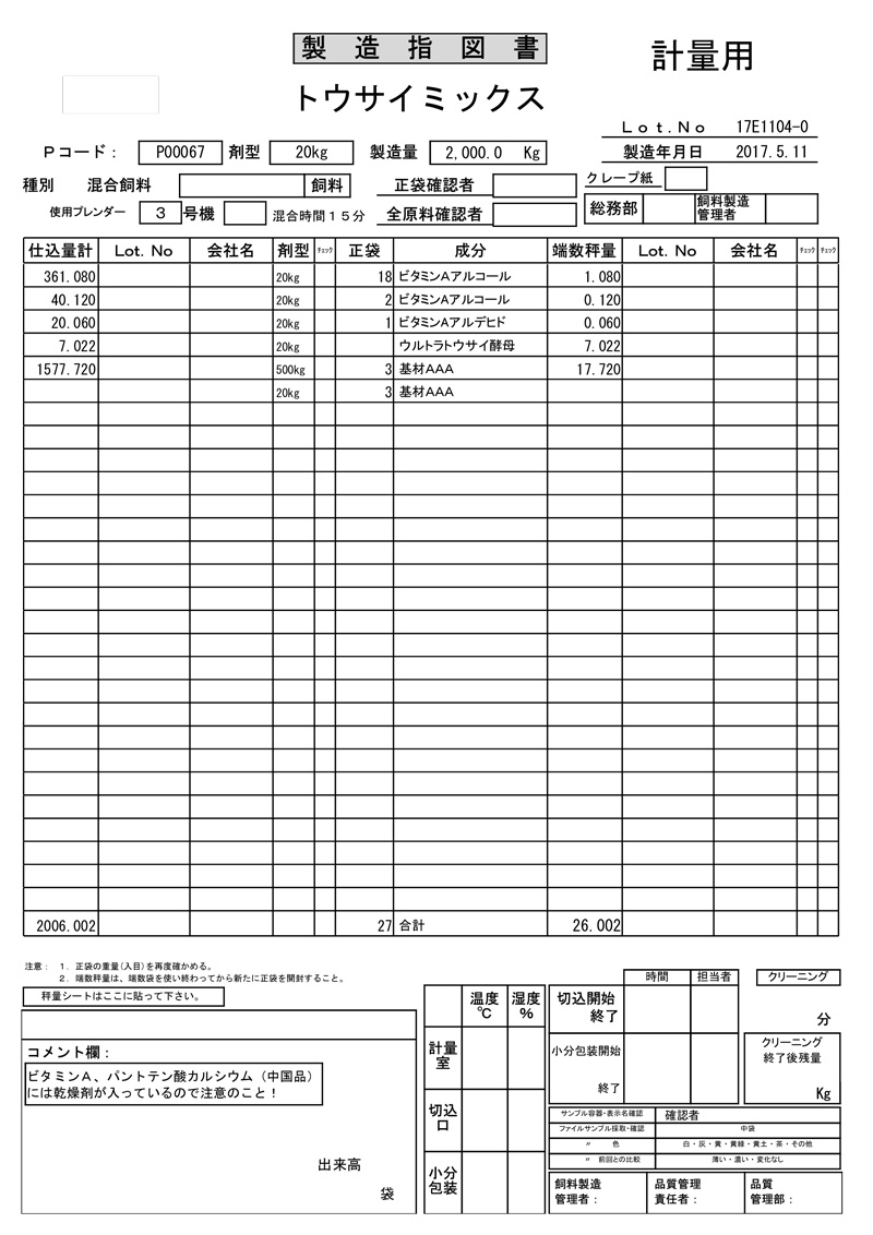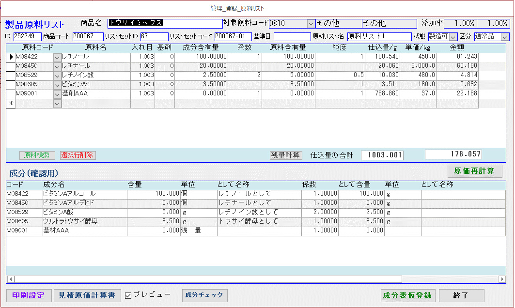 原料計算に関する情報をマスター化することで、プレミックスに係る複雑な計算を自動化し効率化を図れます。