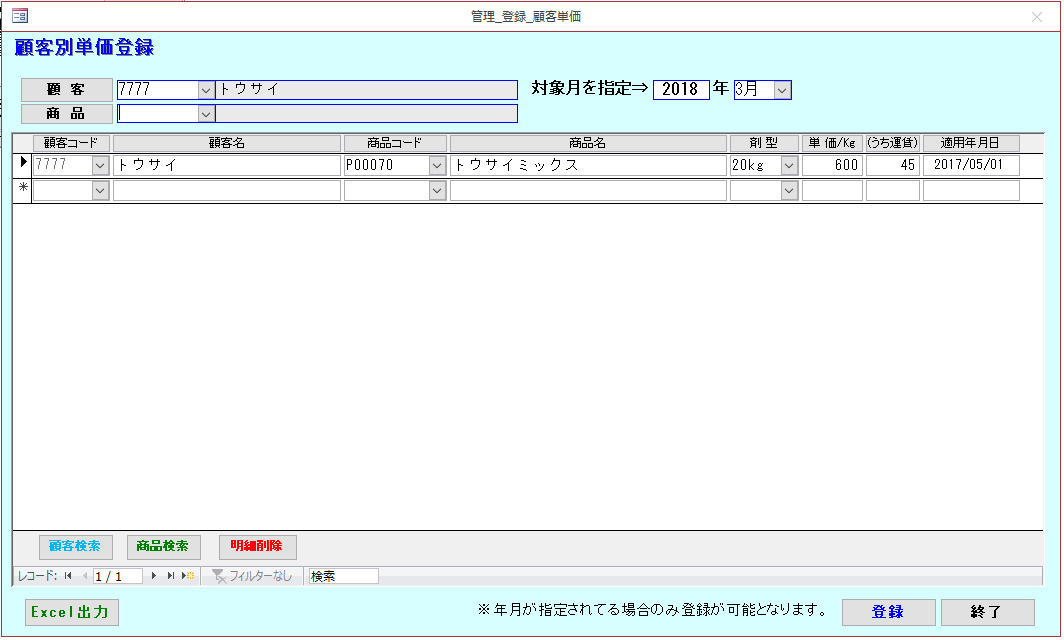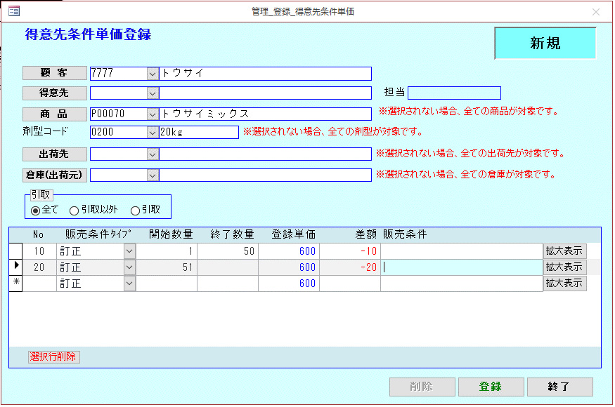 あらかじめ登録された得意先毎の商品単価を出荷先、数量等、様々な条件の元、設定可能です。
