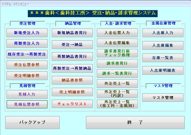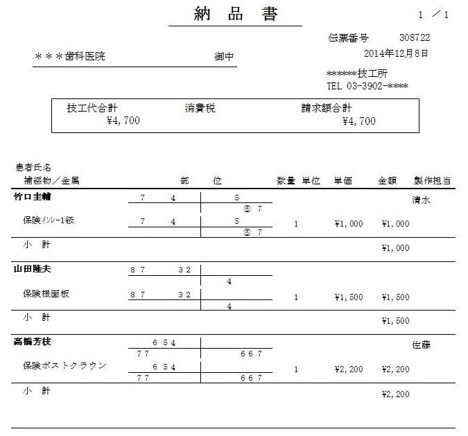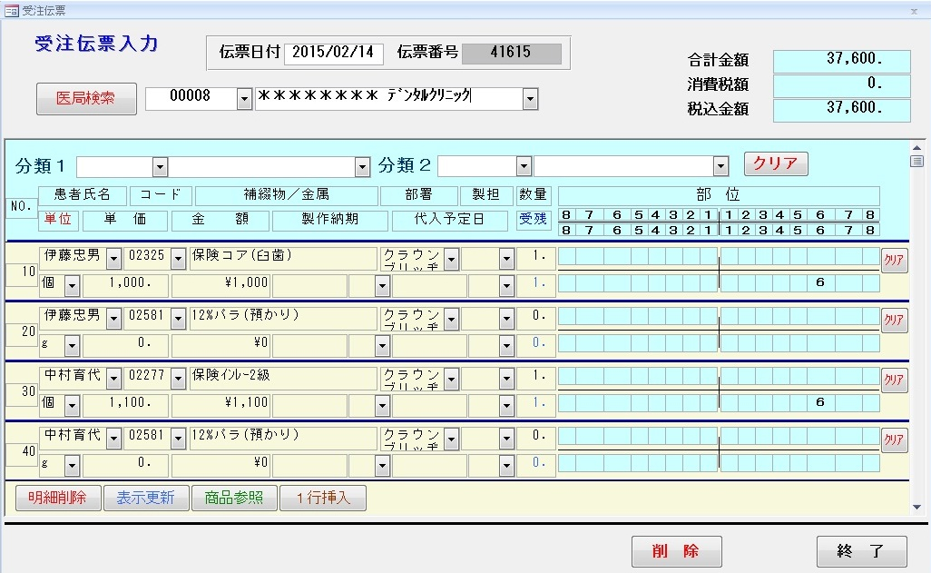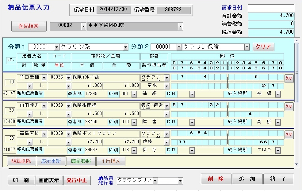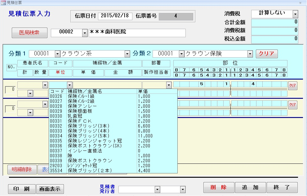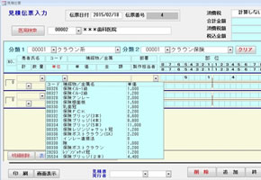 取扱い技工物、補綴物、金属類を2つの分類に分別し、伝票作成時の商品選択操作を簡易化しさらに医局毎に価格登録を可能とし、価格の記載ミスを削減できた。