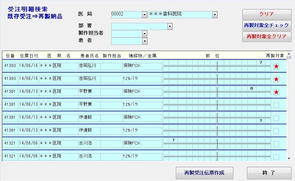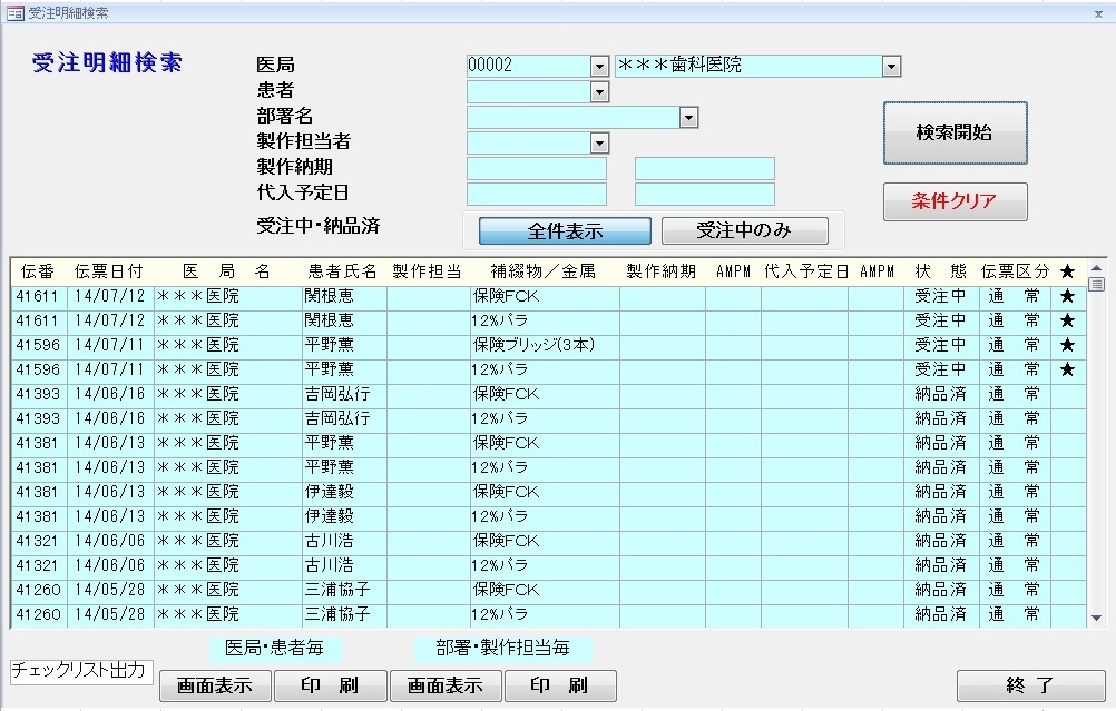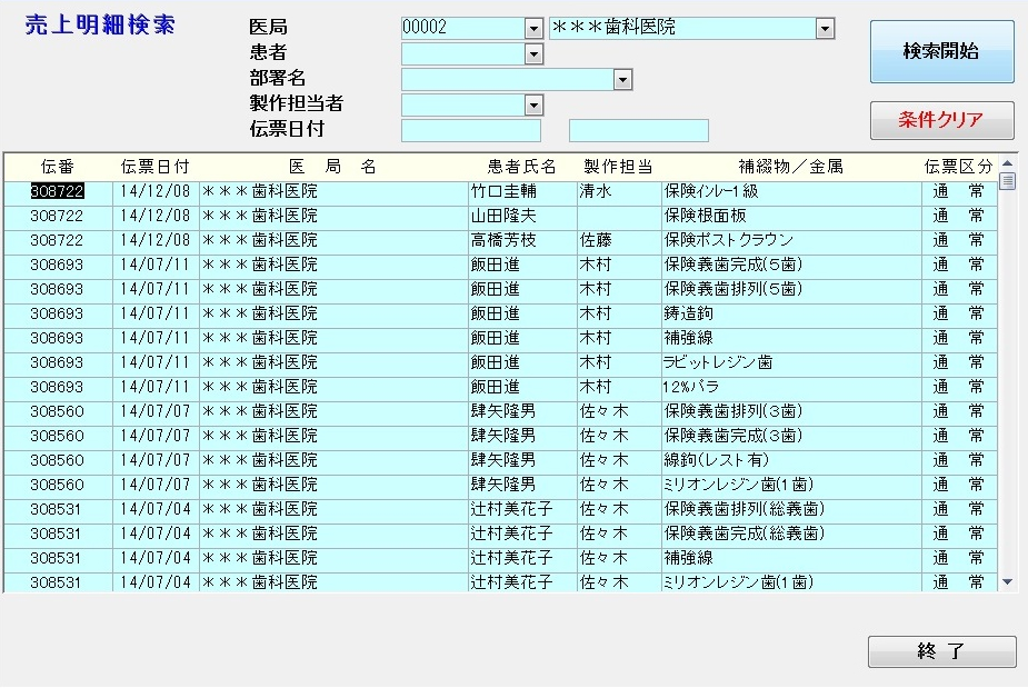 入力済の売上データを活用することで、医局毎、分類毎の、技工物・補綴物の売上管理まで可能に。
